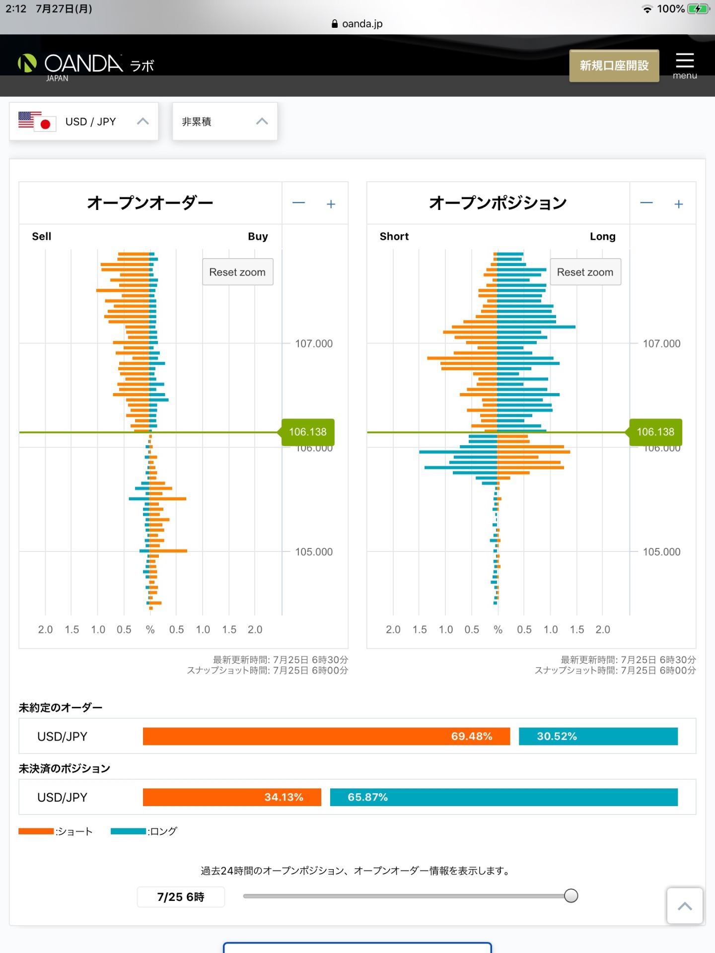 大きなショートポジションのすぐ上に逆指値が並んでいる。これはロングを狙いやすい局面になっている。また、チャートでは日足下ひげなのでこれまたロング優勢!