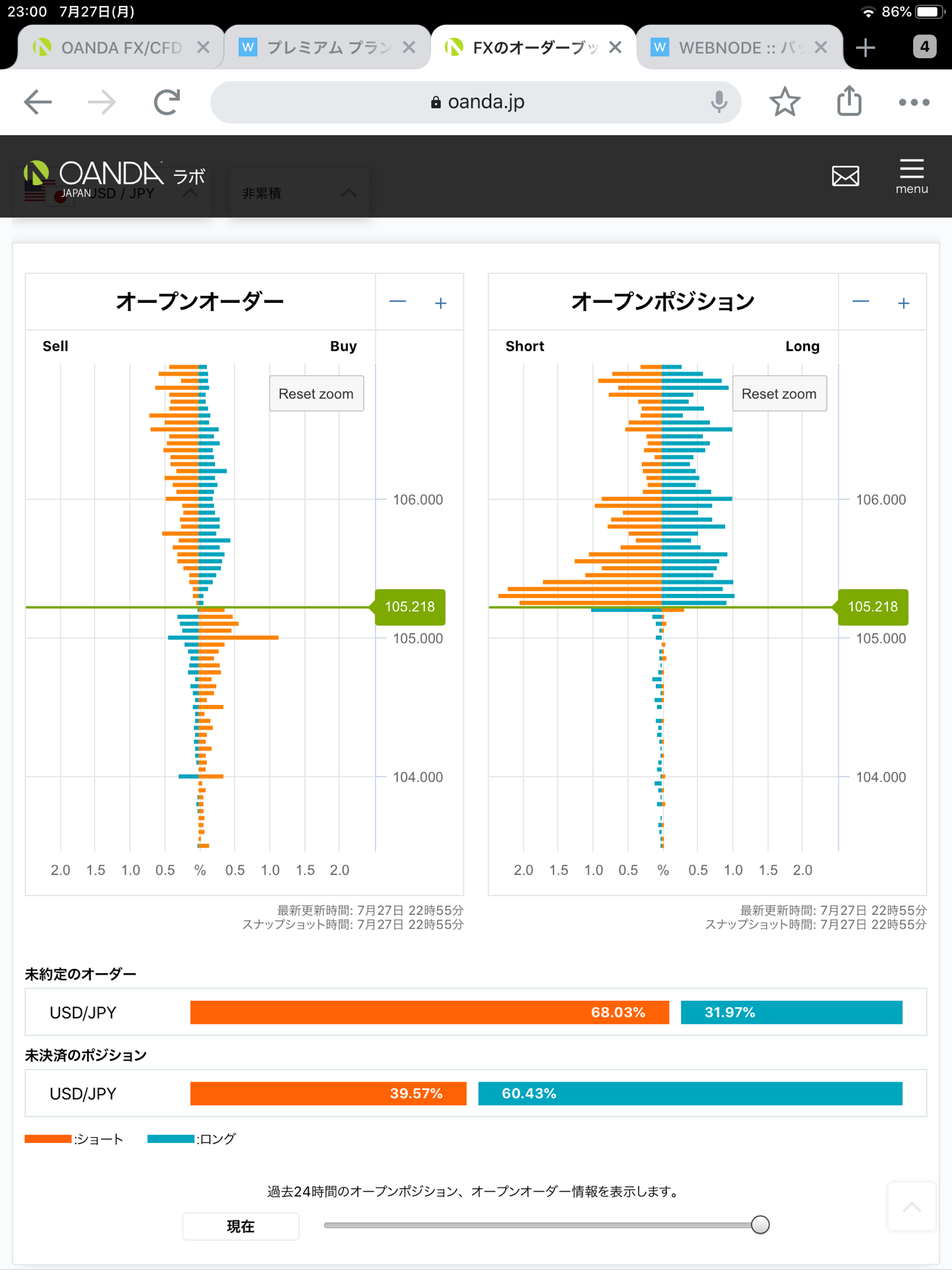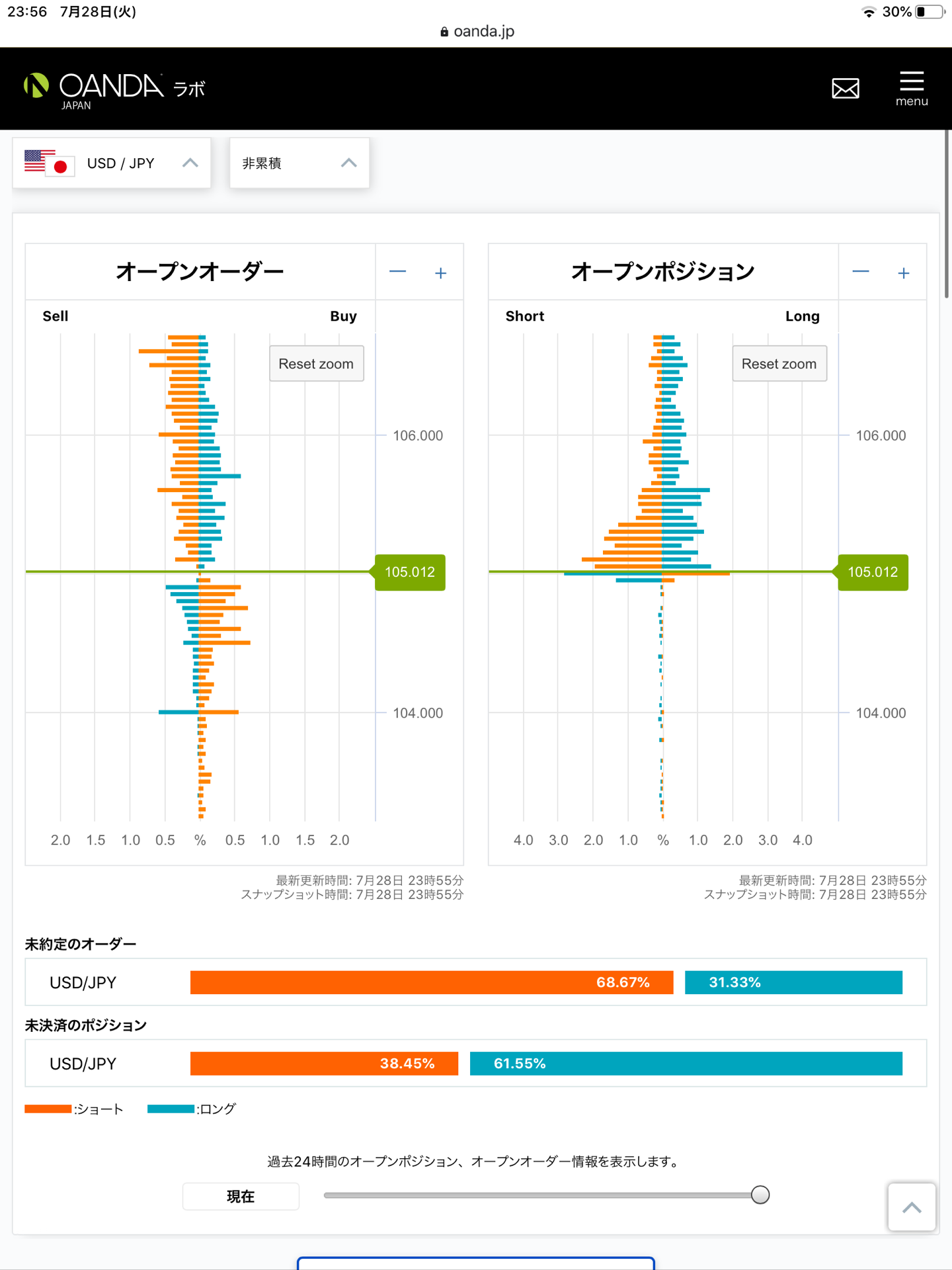 105.0まで下がりロングポジションが減った。逆指値の威力。ここからショートの利確として104.5まで利確ラインが並んでると見てる。